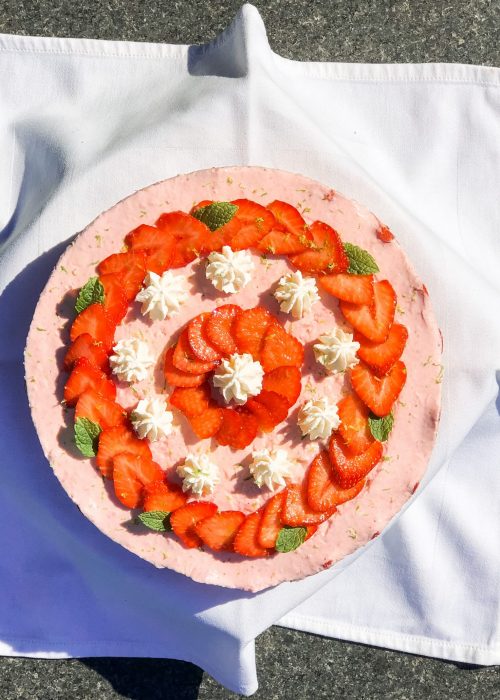 Aardbeien kwarktaart met een bodem van hazelnoten en dadels.